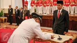 Gubernur Banten Rano Karno Perintahkan Penurunan Foto Atut Presiden Joko Widodo (kanan) menyaksikan pendandatanganan dokumen pelantikan Rano Karno sebagai Gubernur Banten di Istana Negara, ...