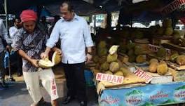 Soal Garuda, Menteri Marwan Balas Cuitan Pramono Anung Menteri Desa, Pembangunan Desa Tertinggal dan Transmigrasi, Marwan Jafar, mencicipi buah durian, di depan kantor Kementerian Desa, ...